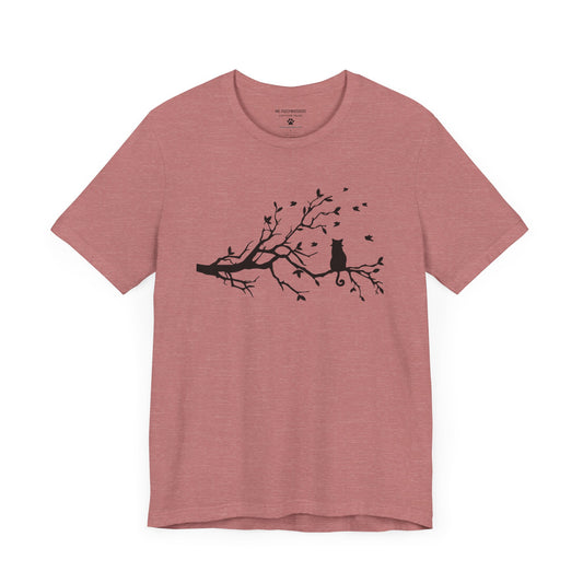 Autumn Cat Silhouette T-Shirt – Cat on Tree Limb with Blowing Leaves | Mr. Fuzzywhiskers