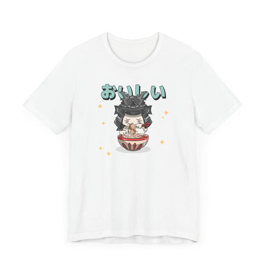 Samurai Cat Eating Ramen T-Shirt - Cute Japanese-Inspired Design