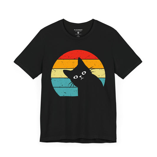 Retro Cat Peek T-Shirt – Funny Tilted Cat with Vintage Sunset Design | Mr. Fuzzywhiskers